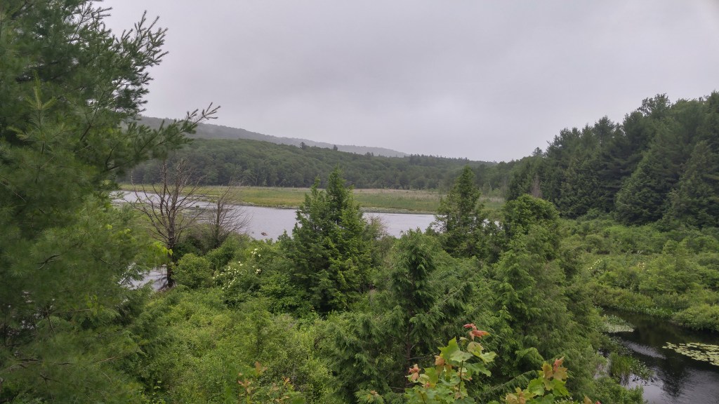 I have read that the American use of the word “vacation” derives from the Adirondacks. The English go “on holiday,” but here in the states we “take vacations.” In the 19th century, residents of New York City and Boston vacated their hot, urban homes for the cool splendor of the Adirondacks. All that vacating coined the term vacation. Take a look out the window. Apart from the rain, it doesn’t get much better than this.
